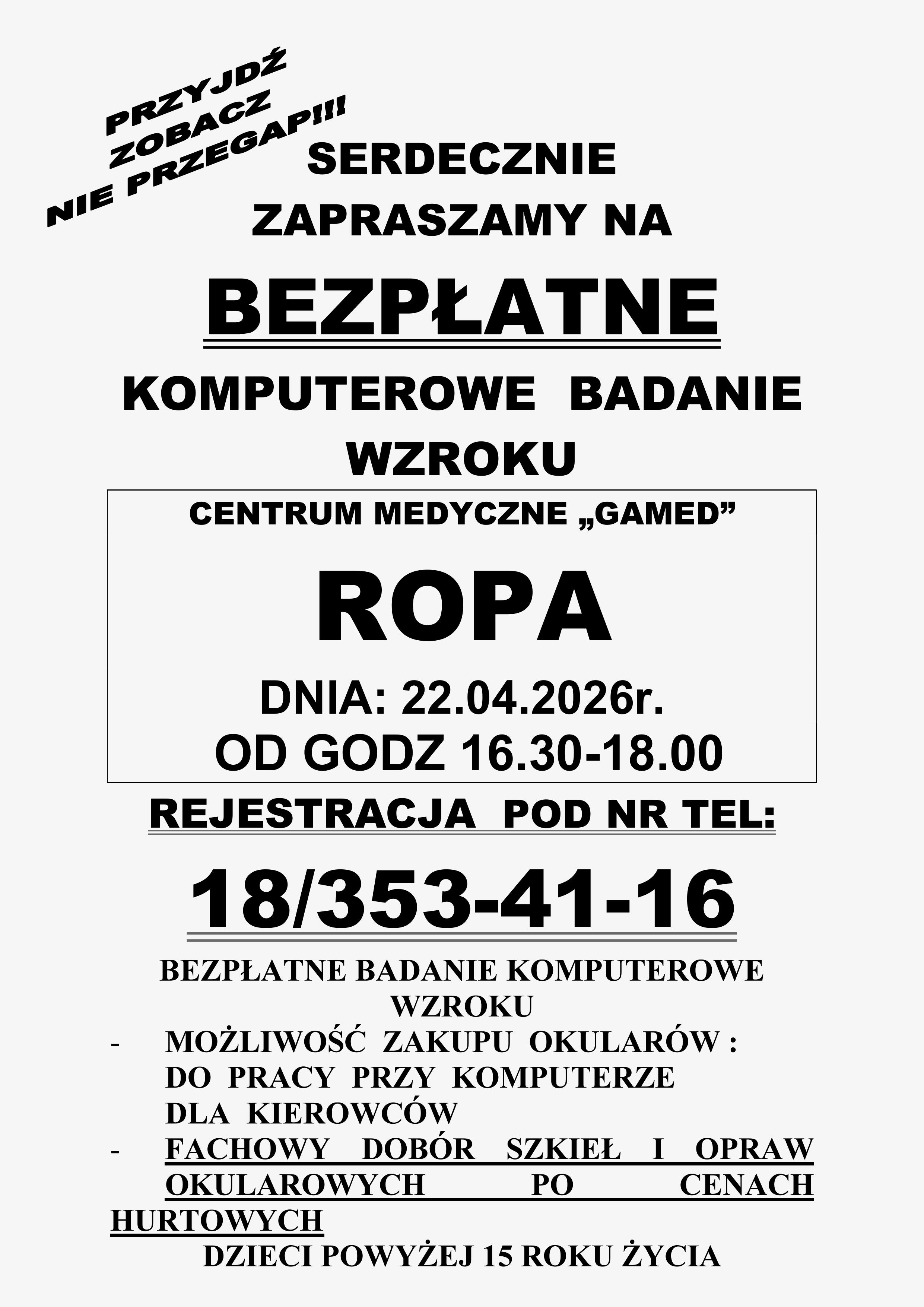 Centrum Medyczne „Gamed" w miejscowości Ropa zaprasza na bezpłatne komputerowe badanie wzroku.