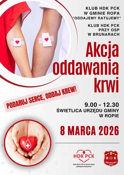 Klub HDK PCK w gminie Ropa "Oddajemy Ratujemy" i Klub HDK przy OSP w Brunarach zapraszają do uczestnictwa w akcji oddawania krwi, która odbędzie się w dniu 8 marca 2026 r. w świetlicy Urzędu Gminy w Ropie.
