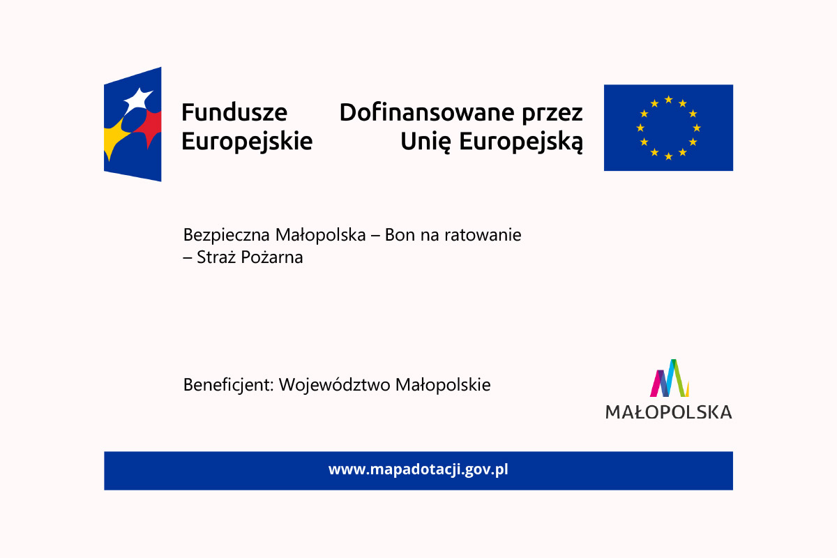 Projekt realizowany jest w ramach Programu Fundusze Europejskie dla Małopolski 2021-2027 (FEM) Priorytet 2. Fundusze europejskie dla środowiska, Działanie 2.11 Wsparcie służb ratunkowych, typ projektów A. zabezpieczenie potrzeb służb ratowniczych.